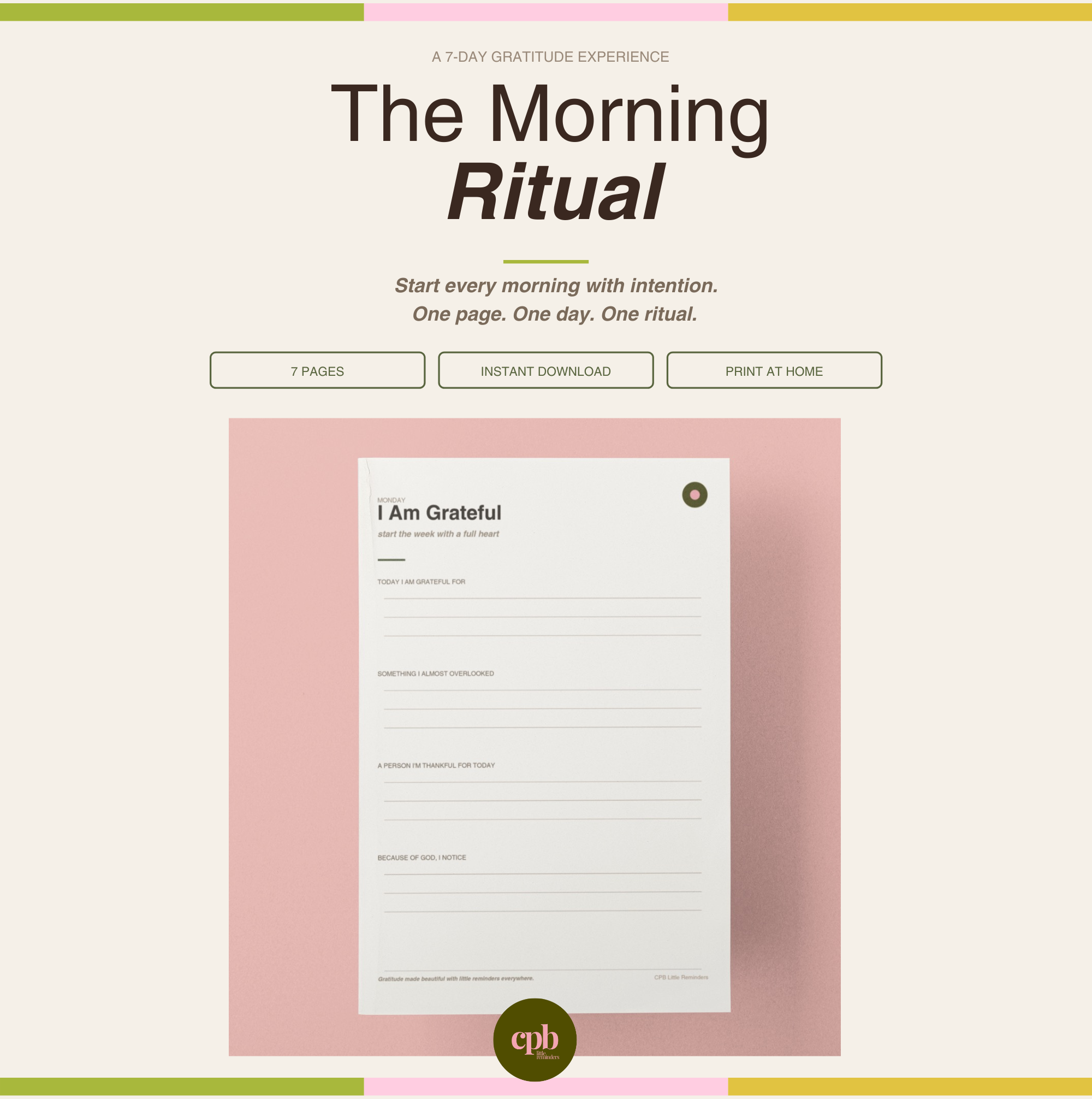 The Morning Ritual is a a A 7-day printable gratitude journal - one page focused for each day of the week.